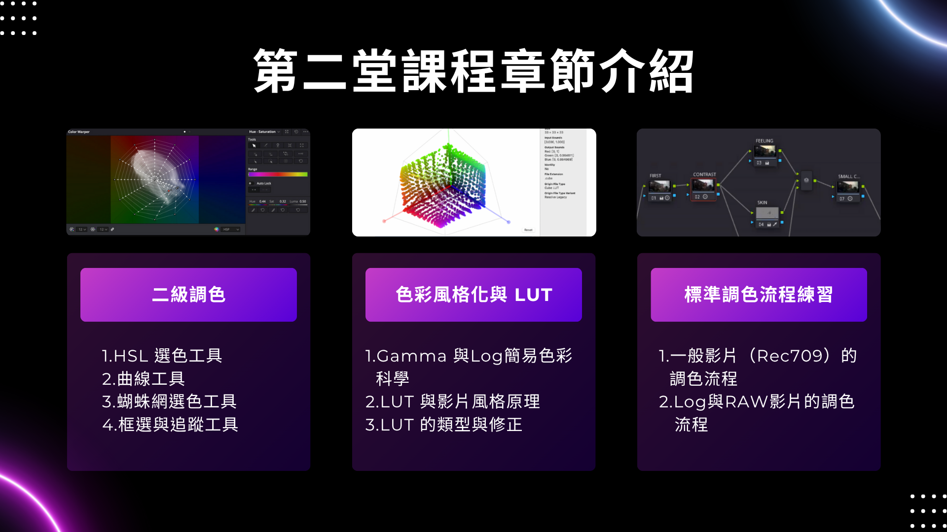 這門課將認識影像成像的原理,以及LUT不同類型對於影片造成的區別在哪,學會面對不同機型時都能夠從容應對。