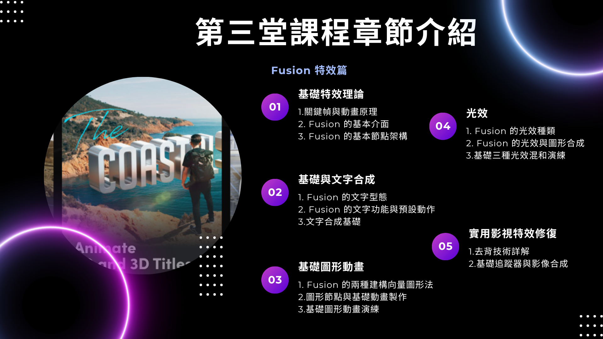 本課程將帶您學習文字、圖形、光效三種最常使用的效果。這門課會帶你打好Fusion的基礎,做出各種實用的小動畫和特效並做出能個人化的電影標題動畫課程講義甚至有80%的特效說明喔!