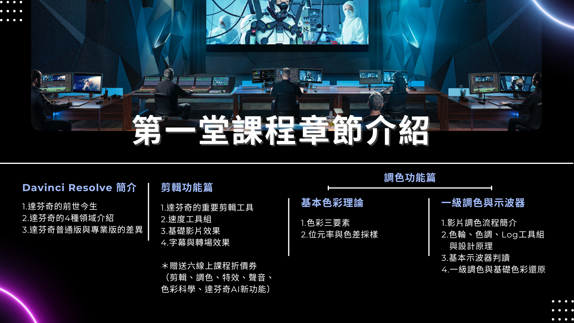 本課程報名即會提供『Davinci Resolve剪輯-剪輯功能操作篇』折價券,若您先前完全沒有過剪輯經驗,建議您於第一堂課前,將本課程作為課前預習。