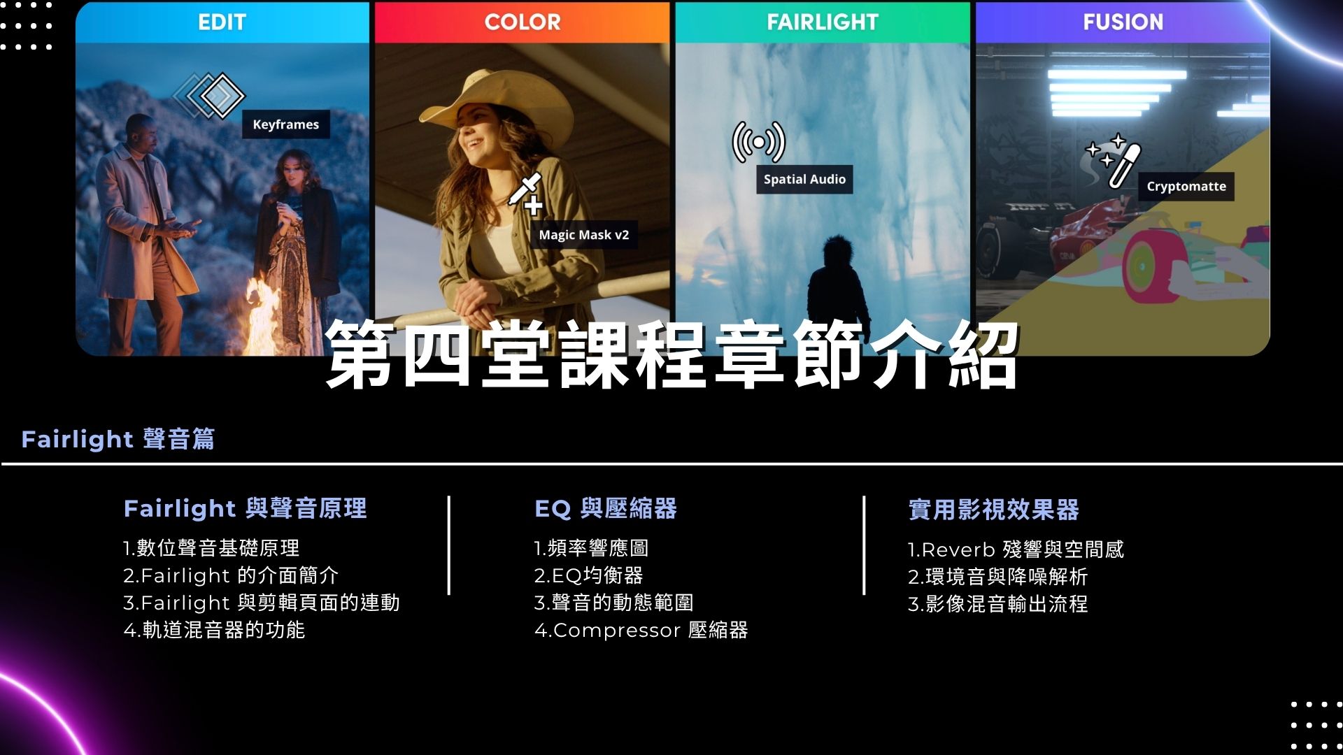 擺脫只能到處找資訊的碎片化學習,那些在免費YT很難學到的調色、Fusion特效和Fairlight聲音後期,在本課程一次梳理學習思路給您,兩週的直播學習開啟一個全新的製片思維與能力。