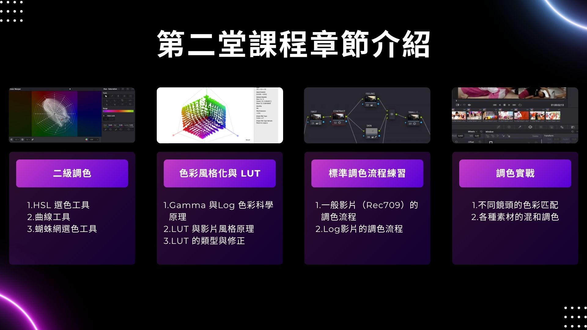 在第一堂課我們不會花費太多時間講基礎的剪輯內容,而是會快速切入重點替您建立『影視製作流程』與『色彩基礎概念』為後續三堂課程搭建穩固基礎,並開啟您真正的調色初體驗,知道業界正確流程的調色步驟與方法,而不是一昧的套濾鏡或是漫無目的的調整,所有的操作都是經過有效判斷後的動作。