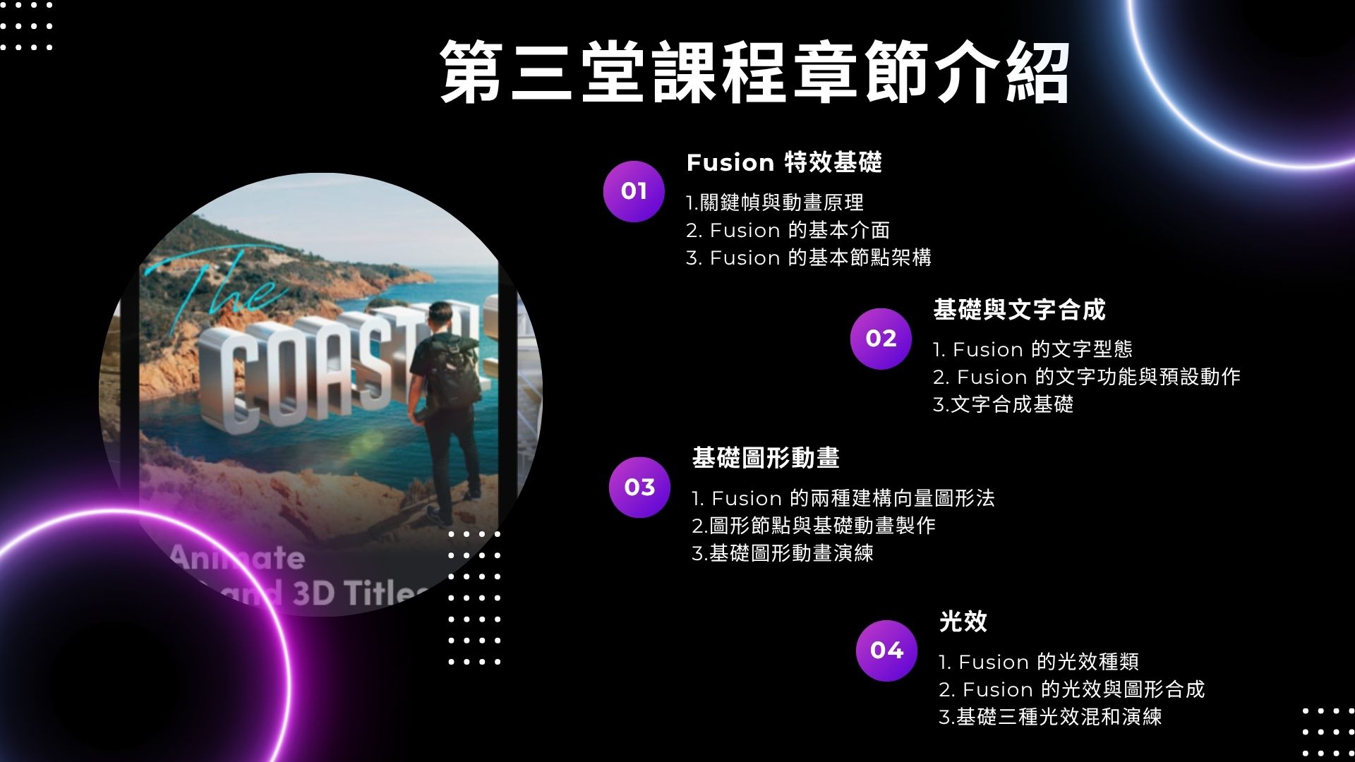 本課程將帶您學習文字、圖形、光效三種最常使用的效果。這門課會帶你打好Fusion的基礎,做出各種實用的小動畫和特效並做出能個人化的電影標題動畫課程講義甚至有80%的特效說明喔!