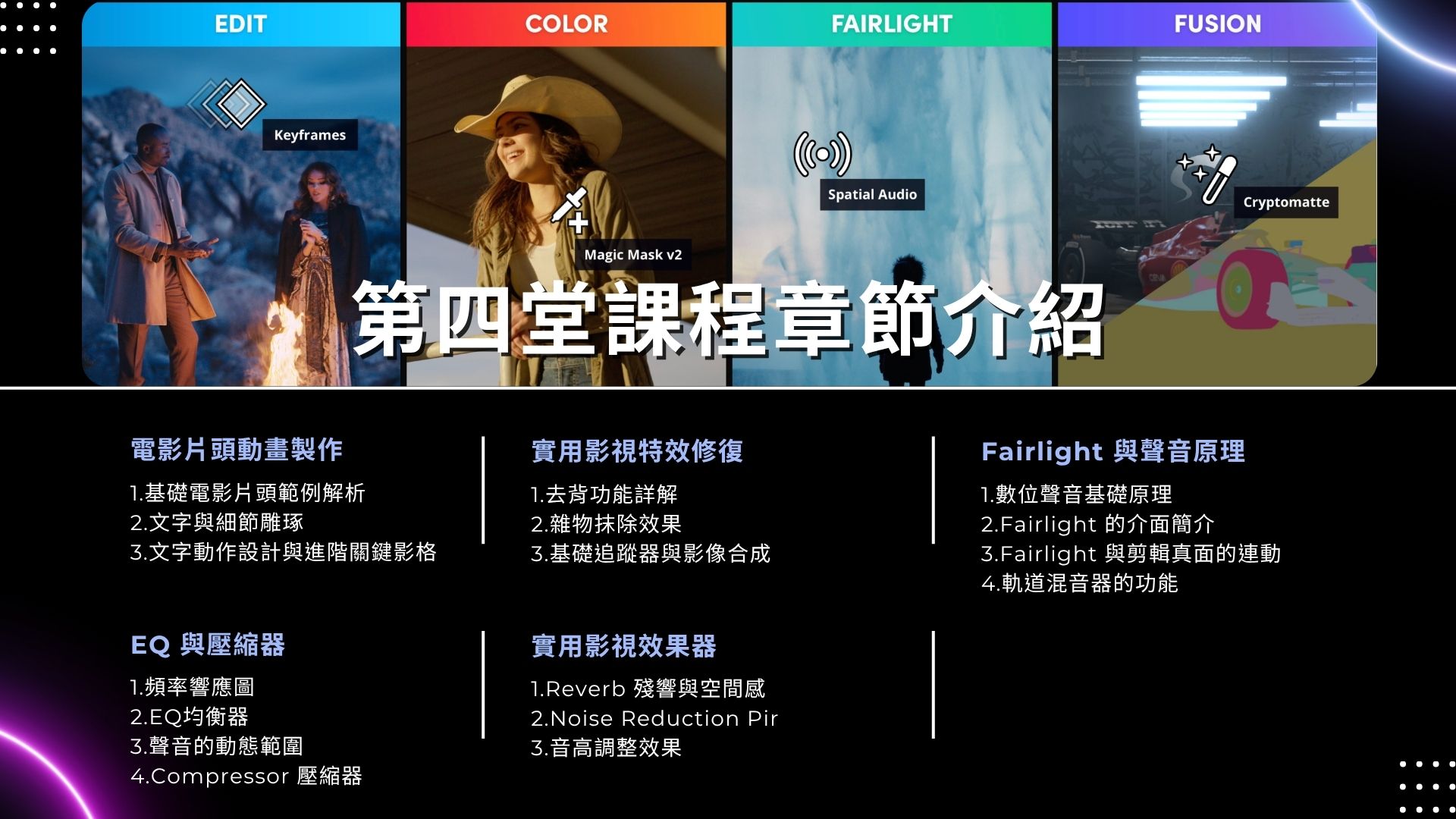 四堂直播課程將會協助學員在最短的時間內掌握達芬奇全方位功能。參加這門課程,你不需要有任何的後期基礎最好能帶著全新的思維,忘掉過去自學一些錯誤或沒根據的作法重新定位好自己,學習真正業界專業的作法。