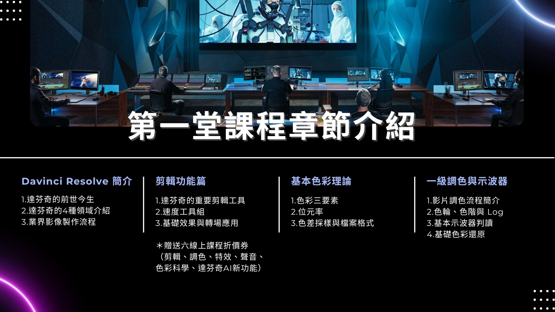 本課程報名即會提供『Davinci Resolve剪輯-剪輯功能操作篇』折價券,若您先前完全沒有過剪輯經驗,建議您於第一堂課前,將本課程作為課前預習。